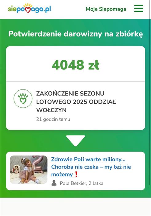 Z całego serca dziękujemy wszystkim Hodowcom Gołębi Pocztowych Oddziału PZHGP Wołczyn za zorganizowanie zbiórki podczas uroczystego zakończenia sezonu lowego 2025 i przekazanie tak wspaniałej kwoty na leczenie Naszej córki Poli. Wasze wsparcie daje nam siłę i przypomina, że nie jesteśmy sami w naszej walce.